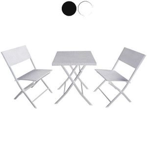 162,00€Struttura acciaio mm 30×15/16 Pz 1 tavolo pieghevole cm 58×58 h 70 – Peso kg 4,5 Piano Synt-Rattan PP Pz 2 sedie pieghevoli cm 45×57,5 h 81 – Peso kg 3 Schienale e seduta Synt-Rattan PP
