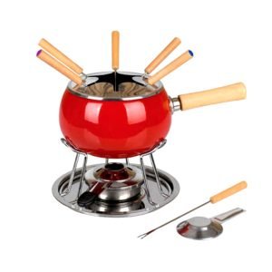 63,00€Pentolino smaltato manico legno Coperchio paraspruzzi acciaio inox Fornello cromato Bruciatore a pasta – Sottopiatto inox 6 forchettine – Ricettario