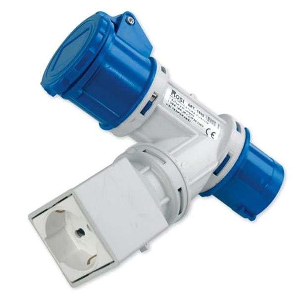 Adattatore spina CEE prese CEE + civile Protezione IP44 1 spina CEE 2P+T 16A volt 230 1 presa CEE 2P+T 16A volt 230 1 presa 10/16A bipasso + SK