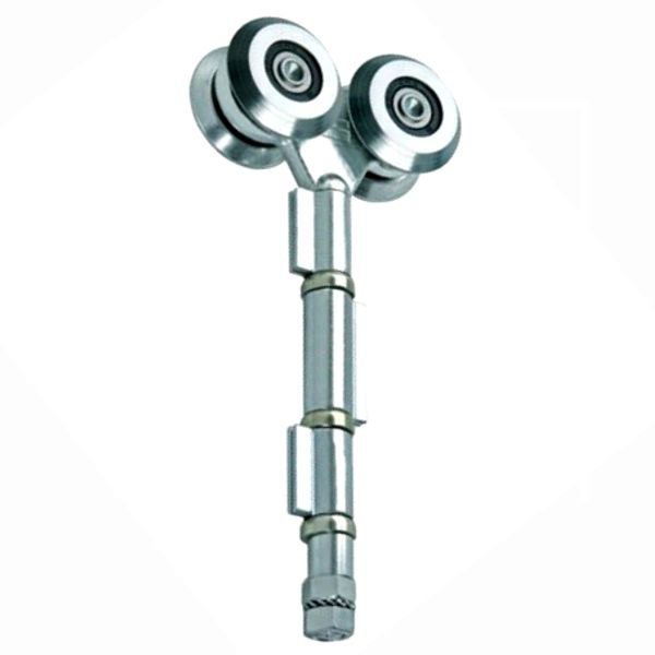 Carrello per portoni scorrevoli fisso Cerniera 3 ali – 2 rondelle intermedie 4 ruote con cuscinettimm 44/54 – Perno M12 Portata kg 280/300 Corpo acciaio stampato zincato
