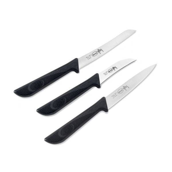 Acciaio inox AISI420 Manico polipropilene Massimaflessibilita’ della lama Conforme certificazioni NSF e ISO22000 Pz 1 coltello verdura cm 6 Pz 1 coltello spelucchino cm 10 Pz 1 coltello pomodoro cm 12 lama dentata Conforme certificazioni NSF, ISO9001 e ISO22000 Lavabile in lavastoviglie – Sterilizzabile