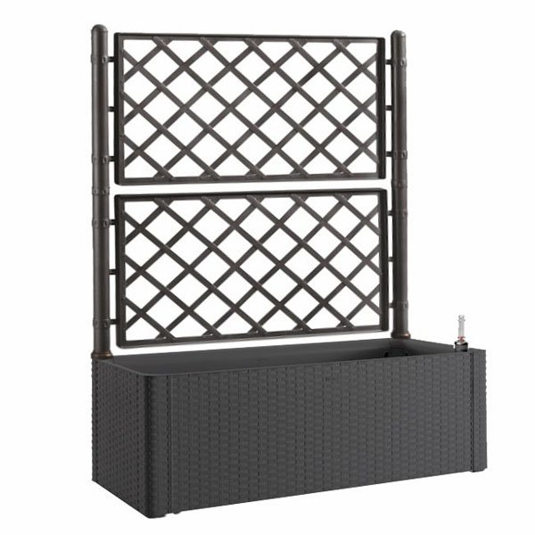 Struttura plastica resistente Dimensioni cm 100×43 h 142 Decoro design simil rattan Spalliera grigliata colore antracite Riserva acqua con indicatoredi livello Adatta per rampicanti