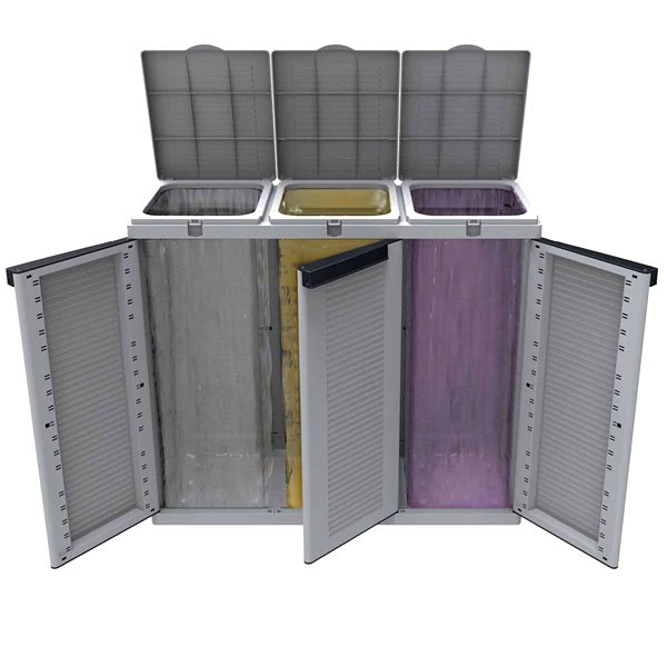 + spedizione, o ritiro in negozioPolipropilene Posti 3 Apertura 3 coperchi superiori e 3 ante frontali Anelli interni fermasacchi Adatto per raccolta rifiuti differenziata