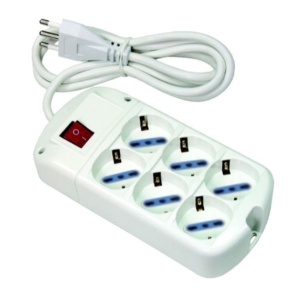 Materiale termoplastico 3+3 prese bipasso 2P+T+SK10/16A 1 spina 2P+T 16A – Interruttore luminoso Lunghezza cavo m 1,5 – Sezione cavo mmq 3×1 Colore bianco