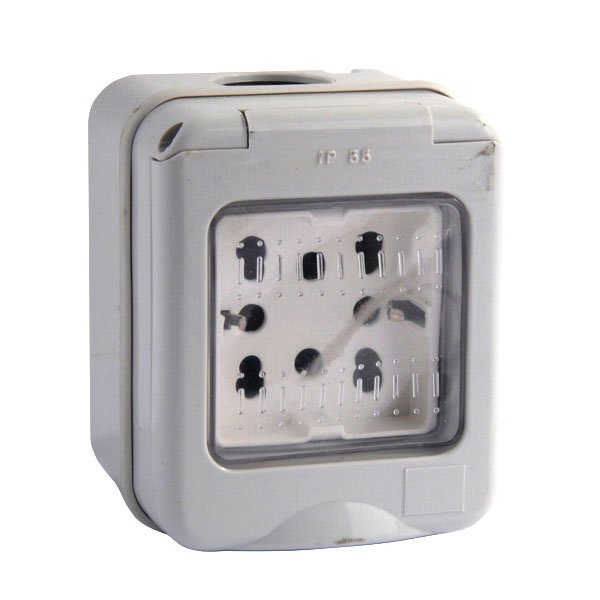 Modulo comando montato su custodia con sportello Installazione a parete Doppia presa 2P+T + 1 SK 10/16A 250V Colore grigio Frutto bianco compatibile magic Sportello trasparente – Protezione IP55