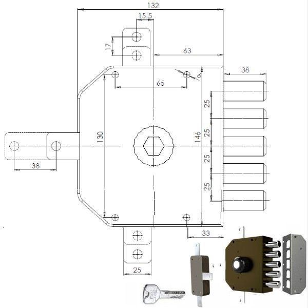 Serratura pompa applicare legno 4 chiusure verticali – Pomolo interno Catenacci laterali 5 pistoni Interasse catenacci mm 25 Scatola mm 132x146x49,5 – Entrata mm 63,0 Cilindro lunghezza mm 50 – Diametro mm 29 Deviatore incluso Aste non incluse 3 chiavi punzonate T200 cod.00940 Profilo riservato Machieraldo