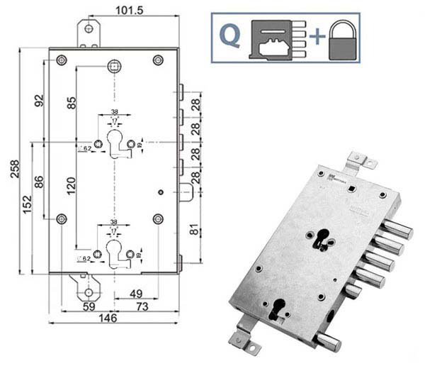Serratura doppio cilindro europeo a planare Fori protettore mm 38 Movimento ad ingranaggi 2 chiusure verticali Catenacci laterali 5 pistoni e scroccoInterasse catenacci mm 28 Scatola mm 258x146x31 -Entrata mm 73 Cilindro non incluso