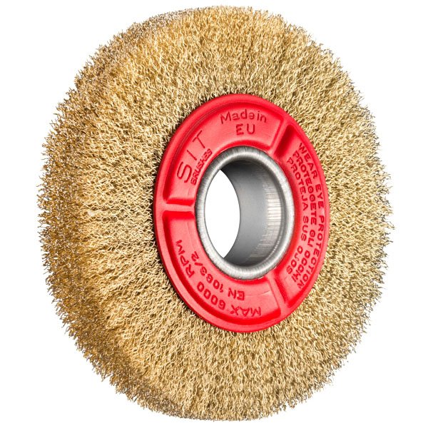 Spazzola a disco con foro mm 16/20/25 Fili acciaio ondulati ottonati mm 0,30/0,35 Diametro mm 100/125/150 Spessore 17/20 – Lunghezza fili 19/32/36 Adatta per sbavatura, satinatura e lucidatura
